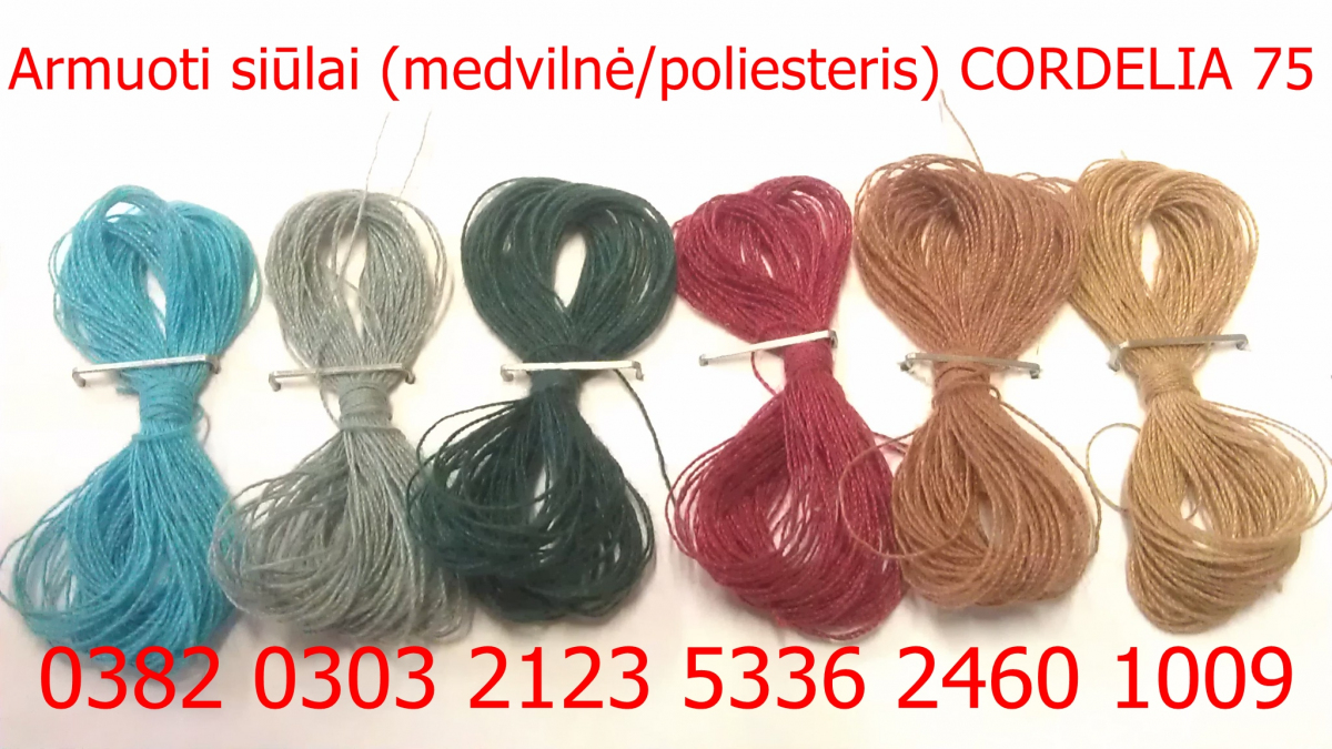 Armuoti siuvimo siūlai CORDELIA 75. Poliesterinė šerdis apsukta medvilne.